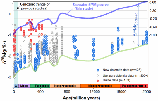 Recently, an international research team led by Professor Weiqiang Li from Nanjing University made a significant breakthrough by successfully reconstructing the history of seawater Mg isotope composition for the past 2 billion years. This represents a remarkable advancement, as previous studies on seawater Mg isotopes were limited to the Cenozoic era, spanning the past 65 million years. Using this new record, the research team reconstructed the history of surface Mg cycles over the last 2 billion years. The study reveals that dolomite, a common sedimentary Mg-rich carbonate mineral, exerts a significant climatic influence. As Earth's temperature rises or volcanic degassing intensifies, dolomite burial increases, removing additional CO2 from the atmosphere. This process mitigates the greenhouse effect and ensures that Earth's temperature does not reach catastrophic levels. Therefore, the dolomite cycle serves as a geo-thermostat that had been under-appreciated previously, offering a potential explanation for Earth's habitability.