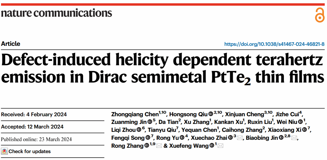 These interesting results were published in the reputed journal of Nature Communications on March 23, 2024 (DOI Foundation-024-46821-8), which is entitled “Defect-induced helicity dependent terahertz emission in Dirac semimetal PtTe2 thin films.” PhD student Chen Zhongqiang, Dr. Qiu Hongsong and Cheng Xinjuan contributed equally to this work. The corresponding authors are Prof. Wang Xuefeng, Prof. Zhang Rong, Prof. Jin Biaobing and Prof. Zhai Xuechao.