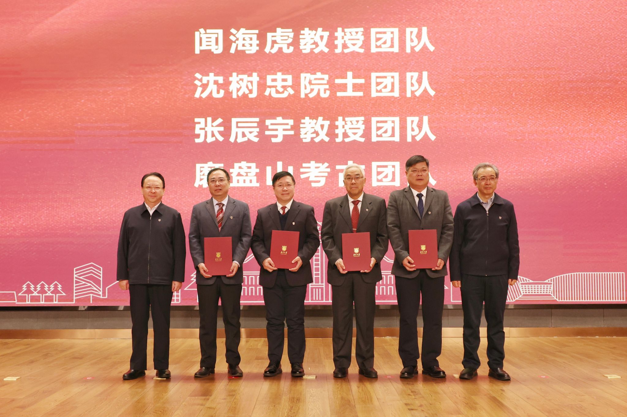 The meeting also announced the "2024 Outstanding Contribution Award." Tan Tieniu and Tan Zhemin presented "NJU Award for Major Contribution to Scientific Research" to Professor Wen Haihu's team, Professor Shen Shuzhong's team, Professor Zhang Chenyu's team and the Mopanshan Archaeological team.