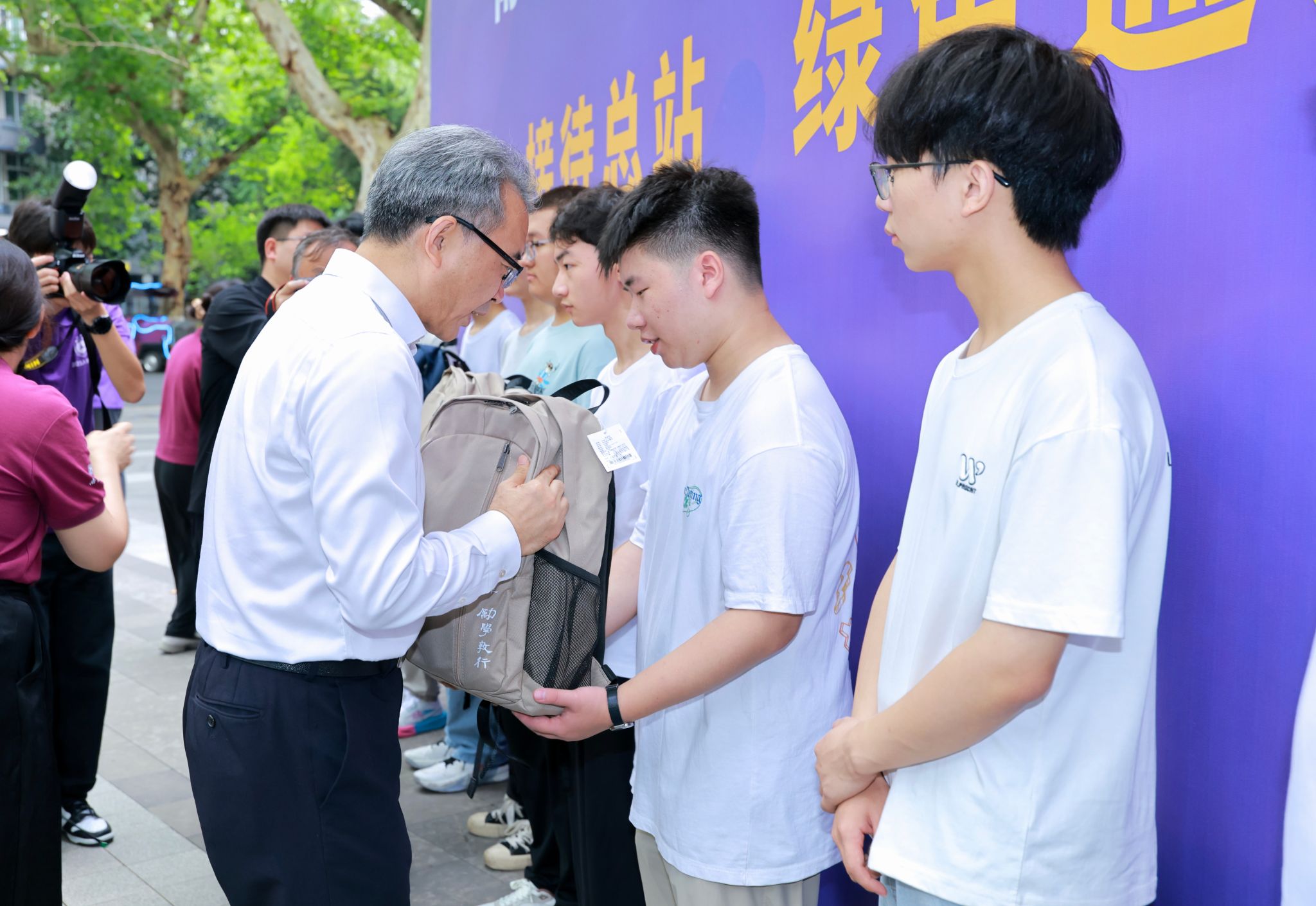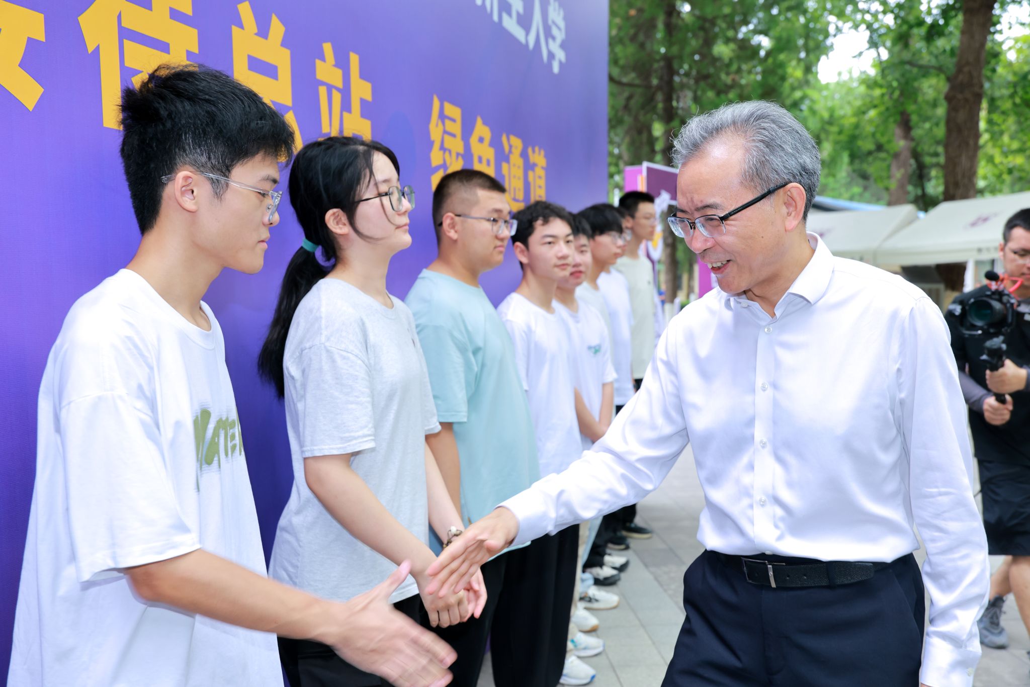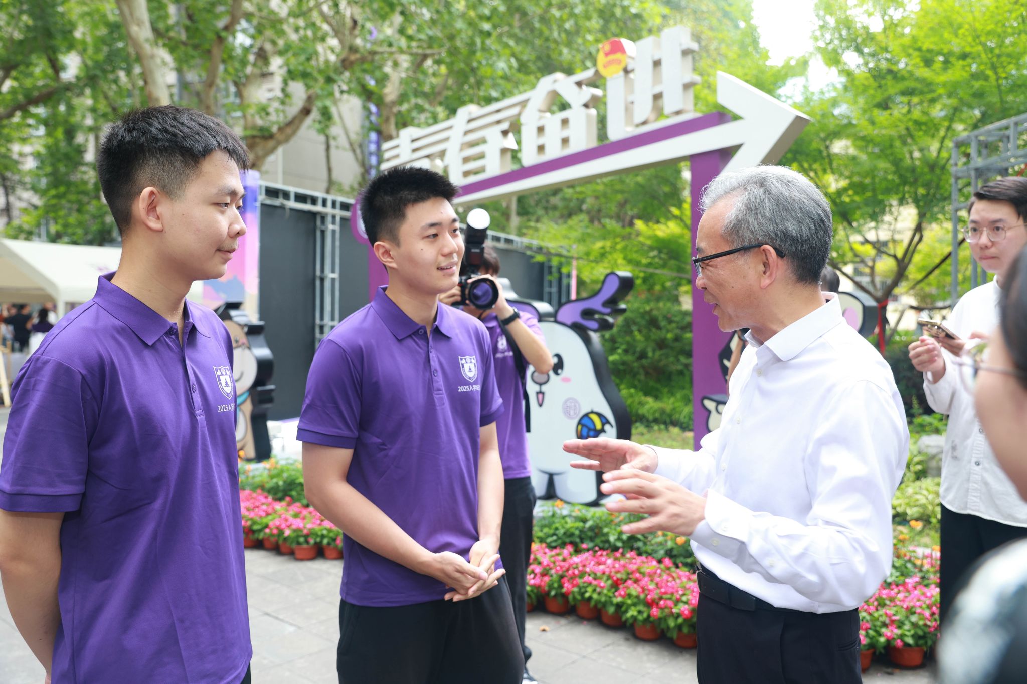 The registration of the 2025 undergraduate freshmen is in full swing, with young people from all corners of the country gathering at Nanjing University. On August 31, Tan Zhemin, President of NJU and Academician of the Chinese Academy of Sciences visited the freshman reception site on Gulou Campus to learn about the welcoming work, greet the 2025 undergraduate freshmen, and visit faculty, staff, and volunteers.