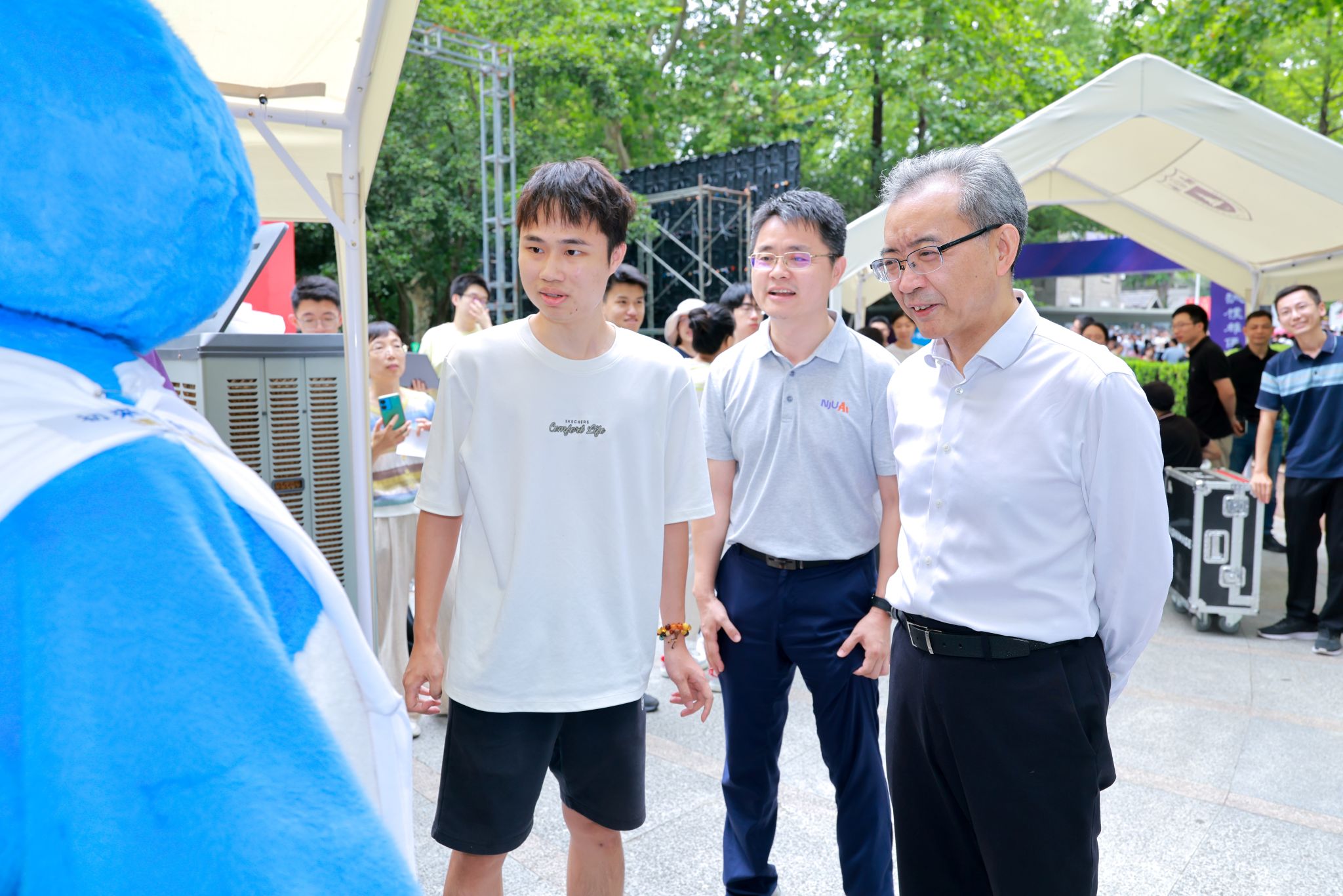 Additionally, a special member joined this year's welcoming team—the robot "Little NJU Whale." Developed independently by an alumni enterprise team with core members from NJU's School of Artificial Intelligence, it is connected to the university's "Little Blue Whale" intelligent assistant platform and can provide freshmen with process guidance, university history explanations, and campus tours. "Do you know how many campuses NJU has?" Tan Zhemin interacted with the "Little NJU Whale" robot, listening to it narrate the university's history.