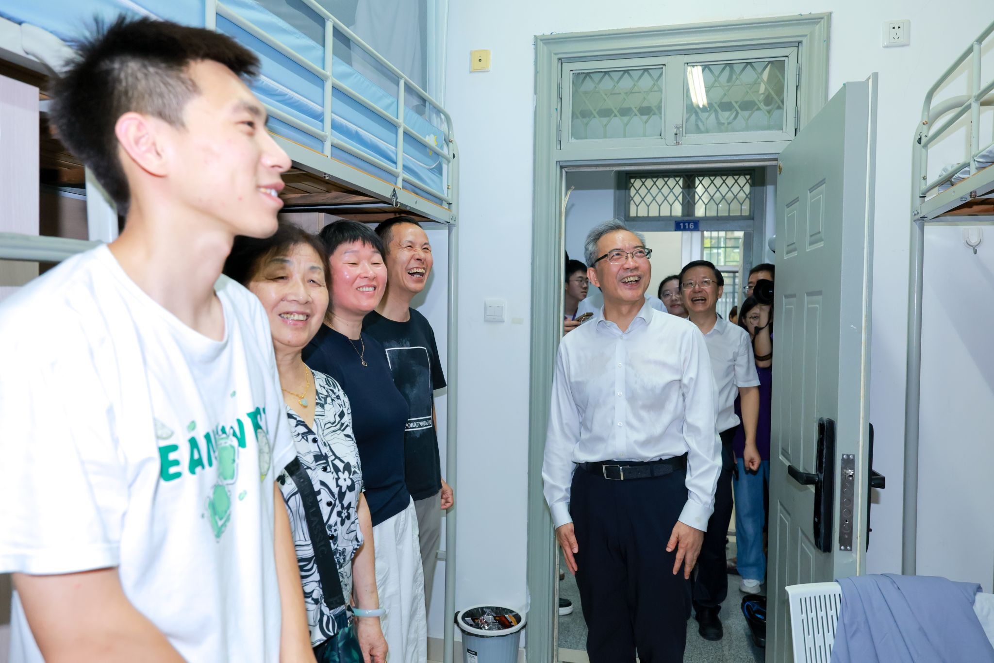 Entering the Nanyuan No. 2 Dormitory, Tan Zhemin cordially communicated with new students and their parents. To facilitate parents' rest, each dormitory specially set up a "Parents' Rest Area," showing NJU's care in details.