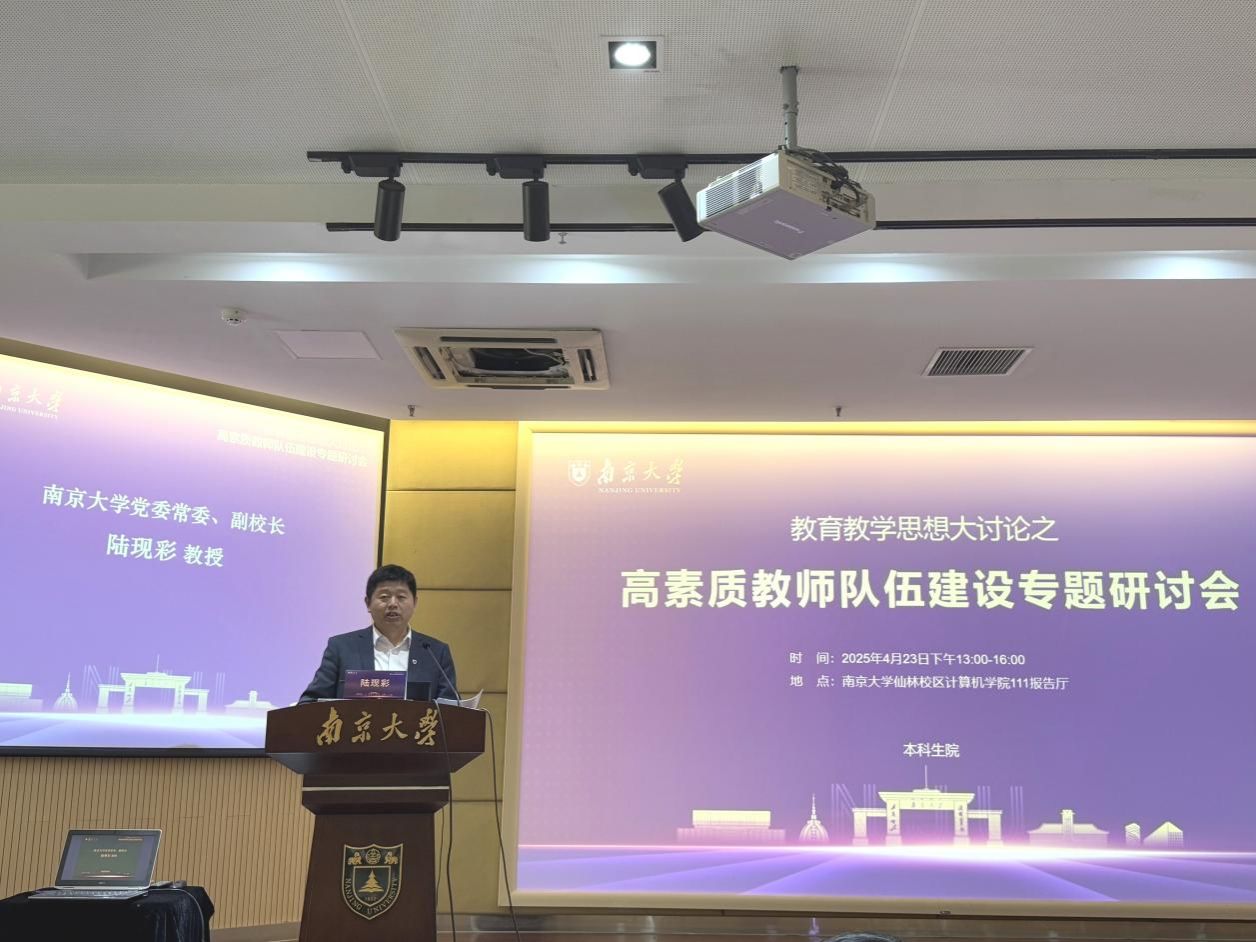 4月23日下午,凯发k8官网“教育教学思想大讨论”—高素质教师队伍建设专题研讨会在仙林校区举行。本次会议聚焦“弘扬教育家精神,推动高素质专业化教师队伍建设”主题。凯发k8官网党委常委、副校长陆现彩出席会议并致辞。会议邀请北京大学教务长办公室主任、教师教学发展中心主任孙华和中国教育干部网络学院高级教研员李琰辉做专题报告,校内相关学院和教师代表做经验分享。