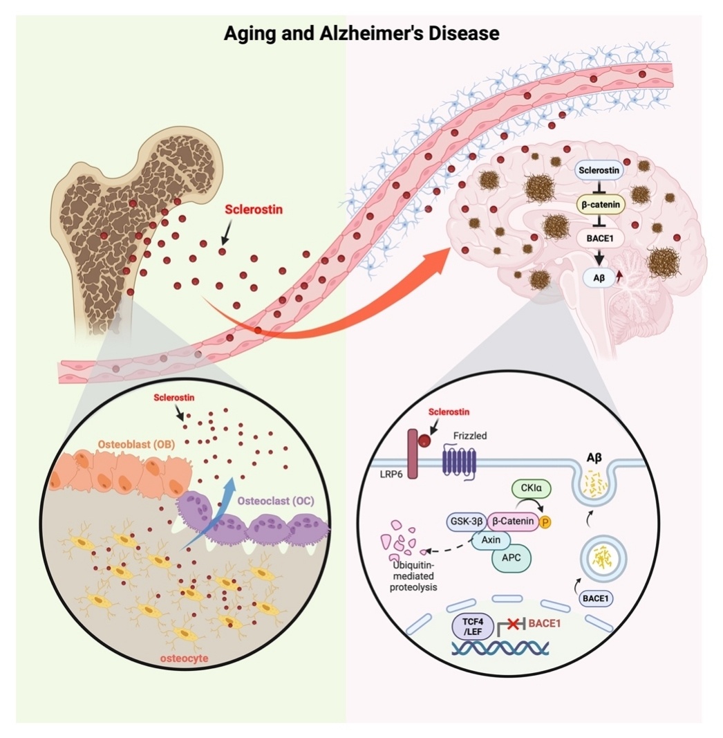 该团队研究发现,在认知功能保持正常的住院患者中,随年龄增长,脑脊液中sclerostin浓度显著上升。sclerostin作为主要由骨细胞表达分泌的蛋白,在老年小鼠皮质骨中表达显著上调,这与脑脊液中浓度增加相一致。进一步研究发现,老年小鼠骨细胞分泌的sclerostin可通过血脑屏障,与神经元细胞表面Lrp6受体结合,参与到随年龄增长的中枢神经元Wnt/β-catenin信号抑制过程。之后研究者通过构建骨细胞特异性Sost基因编辑小鼠模型,明确sclerostin蛋白通过抑制中枢神经元细胞Wnt/β-catenin信号,损害神经元突触可塑性和完整性,从而加速认知功能衰退。此外,Wnt/β-catenin信号在阿尔兹海默症(Alzheimer’s Disease,AD)的发病机制中起到重要作用,随后研究者通过在AD模型小鼠和细胞实验中的研究,明确靶向增加骨细胞源sclerostin蛋白浓度,能通过Lrp6/β-catenin/β-secretase (BACE1) 途径促进Amyloid β(Αβ)蛋白的表达分泌,加速淀粉样板块的形成,加重阿尔兹海默症模型小鼠认知功能的损伤,这一结论与临床患者数据分析结果相一致。