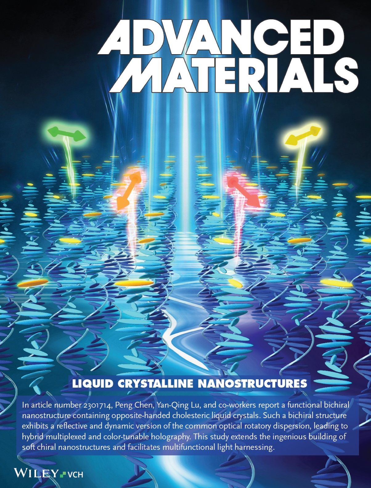 凯发k8官网为该工作的独立完成单位,现代工程与应用科学学院博士生刘思嘉、朱琳为共同第一作者,陈鹏副教授、陆延青教授为共同通讯作者,研究生张逸恒、陈闻、朱栋对本文亦有重要贡献。相关成果以“Bi-chiral nanostructures featuring dynamic optical rotatory dispersion for polychromatic light multiplexing”为题,发表于Advanced Materials(DOI: 10.1002/adma.202301714),并入选当期frontispiece卷首插画论文。该研究由国家重点研发计划(青年科学家项目)、江苏省前沿引领技术基础研究专项、国家自然科学基金优秀青年科学基金及科技创新2030重大项目等资助完成,同时感谢固体微结构物理国家重点实验室、光智能感控与集成技术教育部重点实验室等平台的支持。
