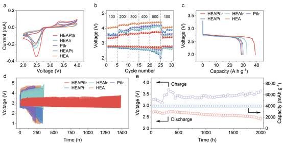 受益于适中的d带中心和吸附强度,使用HEAPtIr作为催化剂的LOB表现出高的放电容量和优异的倍率性能。在1000 mAh g-1的定容测试条件下循环1500小时后能量转换效率保持在70%左右。即使当放电容量增加到4000 mAh g-1时,HEAPtIr仍然可以稳定工作2000小时,表现出良好的催化活性和循环稳定性。
