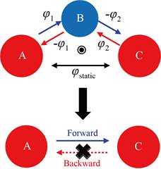 对于带电粒子而言,外加磁场能够有效打破系统的时间反演对称性(Time reversal symmetry),并实现量子霍尔效应(Quantum Hall effect)、阿哈罗诺夫—玻姆效应(Aharonov-Bohm effect)等非互易传输现象。但经典波系统中的声子和光子均属于电中性粒子,无法直接与磁场发生相互作用。为了实现对经典波的非互易操控,人们提出了合成磁场(Synthetic magnetism)的概念,即通过设计含时调制相位来打破时间反演对称性,并实现声波或电磁波的单向传输。在过去十几年中,通过电光调制、声光耦合等手段,光波的合成磁场及非互易的光波操控得以实现。然而,由于声学体系与光学体系的本质区别及声学含时调制的难度,如何设计声波的合成磁场并有效实现声波的非互易操控仍然是一个难题。