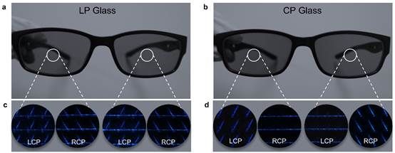 基于以上设计,研究人员利用超构表面阵列分别展示了针对空间均匀和非均匀的偏振态测量。以空间非均匀的偏振测量为例,研究人员基于几何相位的超构表面制备了空间快速变化的矢量偏振光(如图3所示),并基于神经网络辅助的手性超构表面阵列对其进行测量,可准确得还原其空间不同位置的偏振态分布。图3(g) 为神经网络解算结果,3(h)为实际设计的偏振分布。研究人员进一步展示了该方案在实际生产生活中的应用,以外形相似的太阳镜和3D眼镜的区分为例(见图4),通过采集到的不同的焦面分布,可直接区分其功能属性。
