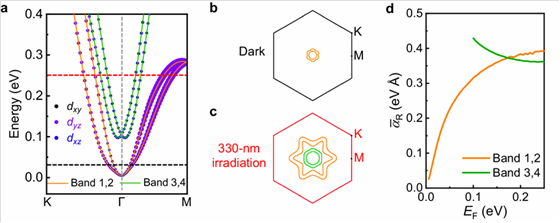 为了从理论上来揭示非互易输运增强的微观机制,课题组通过第一性原理计算构建了(111)晶面的KTO能带(图2a),分别计算了黑暗环境与光照环境的费米面形状(图2b,c)。在330 nm光照下,光生载流子浓度的提高使费米面进一步升高,穿过了Ta 5d轨道更高能量的子带,从而诱导了Lifshitz转变,并使二维电子气的Rashba系数(αR)提高了近10倍(图2d),导致了更大的自旋劈裂。此外,通过对平方磁电阻的拟合,他们发现光生载流子的迁移率也得到大幅提高,载流子弛豫时间(τ)提升了10倍左右。最后,根据表征物理图像的非互易输运系数品质公式γ αRτ2/EF,定量地印证了非互易输运系数三个数量级的巨大增强。该工作所展示的界面光生载流子分离诱导非互易输运增强的策略,不仅为在非中心对称体系中调控非互易输运提供了新的途径,也为未来新型光控整流器件和自旋轨道器件的发展和应用奠定了基础。