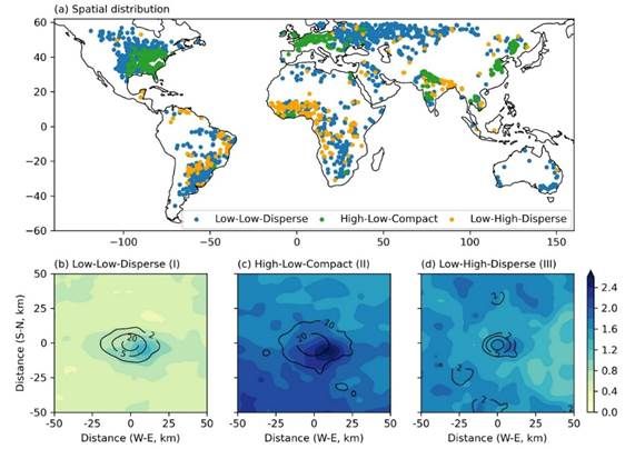 图1 (a)三种城市扩张方式:类型I:城市覆盖度低、城市化速率低、城市布局离散;类型II:城市覆盖度高、城市化速率低、城市布局紧凑;类型III:城市覆盖度低、城市化速率快、城市布局离散。(b-d)降雨异常空间分布。第二种紧凑型城市扩张在城区及附近地区产生了较大的降雨增加;而另外两种增加不明显,其中第三种离散型的快速城市扩张,降雨增加主要集中在郊区。