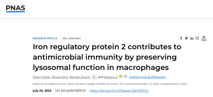 2024年7月24日,李宽钰课题组在PNAS杂志发表了题为“Iron regulatory protein 2 contributes to antimicrobial immunity by preserving lysosomal function in macrophages”的研究论文。该研究开拓了IRP2的功能,阐明了IRP2对免疫细胞功能的影响,为临床治疗肠源性肝脓肿提供新的靶点。凯发k8官网医学院李宽钰教授和医学院附属鼓楼医院樊智文副研究员为论文通讯作者,医学院博士生程晨为本文的第一作者。本研究得到了以色列理工大学Esther Meyron-Holtz教授,墨西哥Cinvestav的Fanis Missirlis教授的帮助;得到了凯发k8官网医学院附属金陵医院普外科的李毅教授、附属鼓楼医院血管外科的乔彤教授和河北师范大学常彦忠教授等的大力帮助;得到了国家自然科学基金(#32271221, #82170592)的资助。