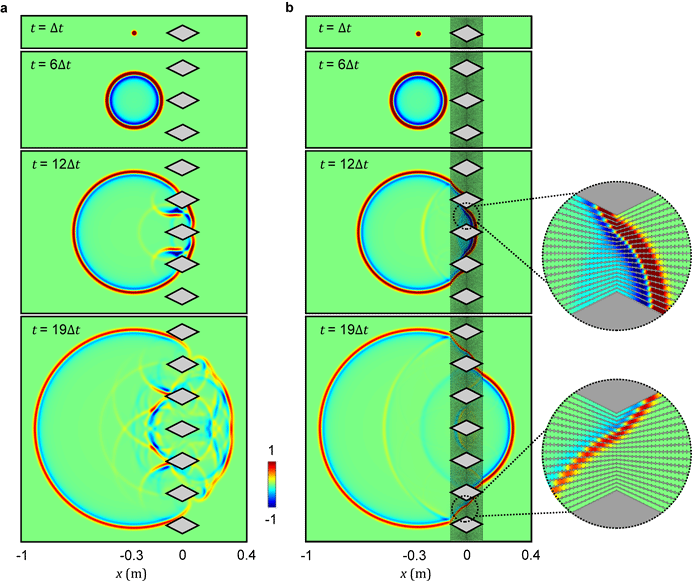 进一步地,研究团队通过脉冲仿真模拟,展示了空间消失和时间偏移的现象,如图3所示。在声波脉冲激发下,器件能够有效地消除由障碍物产生的散射。此外,从透射波前可以看出,激发源的位置似乎往前偏移了一些距离,这个距离对应了幻像声学隐身器件所占据的空间,由此,称之为空间消失的现象。正是由于消失的空间和隧道中相位延迟的存在,透射波前也展现出时间偏移的现象。