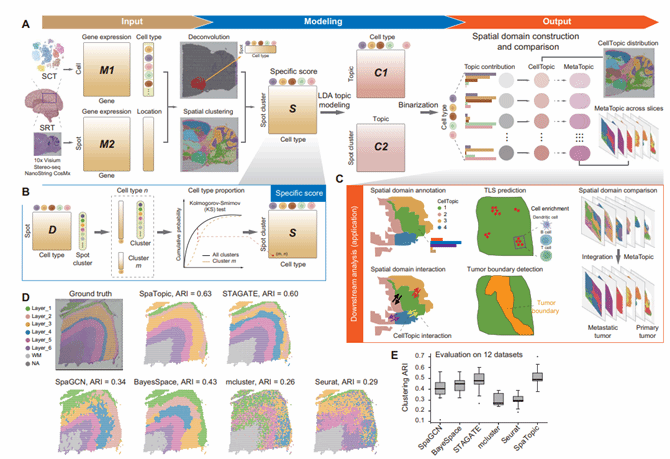 近日,凯发k8官网陈迪俊团队在肿瘤微环境空间域识别方面取得新进展,他们开发了一种名为 SpaTopic 的统计学习框架,通过主题建模(topic modeling)将空间转录组数据的聚类和反卷积分析有机结合,能够将肿瘤微环境划分为具有一致细胞组成的空间域,从而实现对其精细的功能注释。SpaTopic能够精准识别多种与肿瘤功能相关的空间域,包括三级淋巴结构和肿瘤边界等。更为重要的是,SpaTopic 推断出的空间域标记基因稳定性强,具有良好的迁移能力,能够用于预测新数据集中的空间域。此外,SpaTopic 还支持跨数据集的空间域定量比较和功能分析,为肿瘤微环境的功能解析提供了强大的工具和全新视角,其推断出的空间域标记物具有广泛的应用潜力。