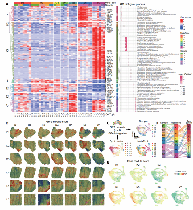 然后,通过深入分析不同 MetaTopics 间的基因表达模式,得到 907 个基因在各MetaTopics中表现出显著差异,并将它们划分为七个不同的基因模块(K1 到 K7)。例如:基因模块 K3 在转移特异性 MetaTopic M7 中显著高表达,包含脂肪酸代谢和急性炎症反应等生物过程,标志着肿瘤转移的特征。模块 K4 和 K5 在原发肿瘤相关 MetaTopics中活跃,涉及能量生产和代谢调控等功能。模块 K7 在原发和转移相关的MetaTopics间共享,富含免疫相关通路。通过整合六个空间转录组数据集,MetaTopics在相似的基因表达模式的特定点聚类中明确映射,进一步验证了SpaTopic在空间域定量比较和功能注释中的有效性。