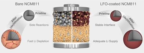 近日,凯发k8官网郭少华、周豪慎团队开发了预锂化剂Li5FeO4(LFO)涂覆富镍层状氧化物,作为无锂负极ASSBs的正极。涂覆的LFO可作为界面保护层,防止高度氧化的富镍正极与硫化物固态电解质(SSE)发生反应,减轻富镍正极的结构降解和SSE的分解,从而实现出色的循环寿命。在无锂负极ASSBs的正极涂覆LFO后,可逆容量从174.7 mAh g-1提高到199.7 mAh g-1,100次循环后的容量保持率从33.8%提高到84.8%。此外,配备LFO-NCM正极的无锂铟层负极全固态软包电池实现了106.2 mAh的可逆容量,并在100个循环中保持了可逆的(脱)锂化。配备LFO-NCM正极的无锂硅负极全固态软包电池可以获得1.1 Ah的放电容量和高达440 Wh kg?1的高能量密度(基于复合正极、无锂硅负极和SSE膜的总质量)。工作表明,对于使用无锂负极和基于硫化物的SSE的ASSBs来说,使用预锂化剂和保护层两者对于获得高能量密度和稳定的循环寿命也很重要。