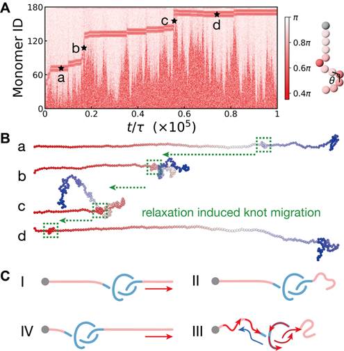 图3:(A)活性链的键角分布随时间的演化揭示了一个纽结在链上的间歇性跳跃。(B)纽结迁移不同阶段的代表性构象,对应图A中的五角星标记。(C)导致纽结定向迁移的非平衡“棘轮效应”示意图。