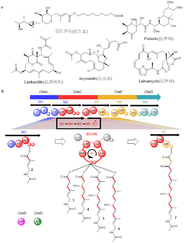 图a、优良活性的trans-AT聚酮分子;b、trans-AT聚酮合酶CheC的特殊迭代作用方式