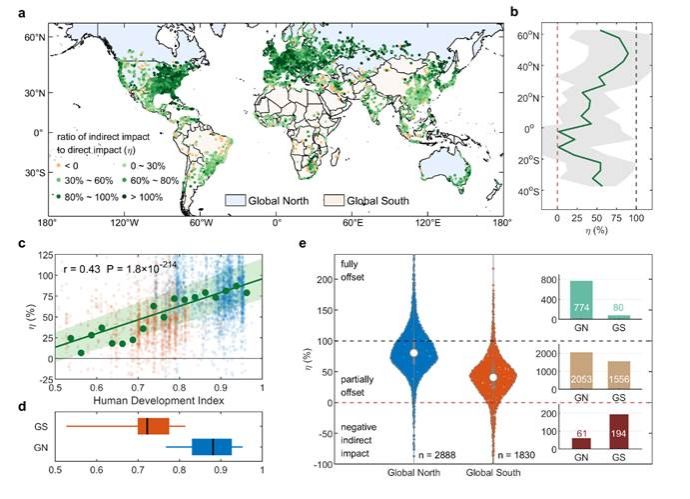 图2. 2000–2019年全球城市化对植被的间接影响相对于直接影响的补偿比例。