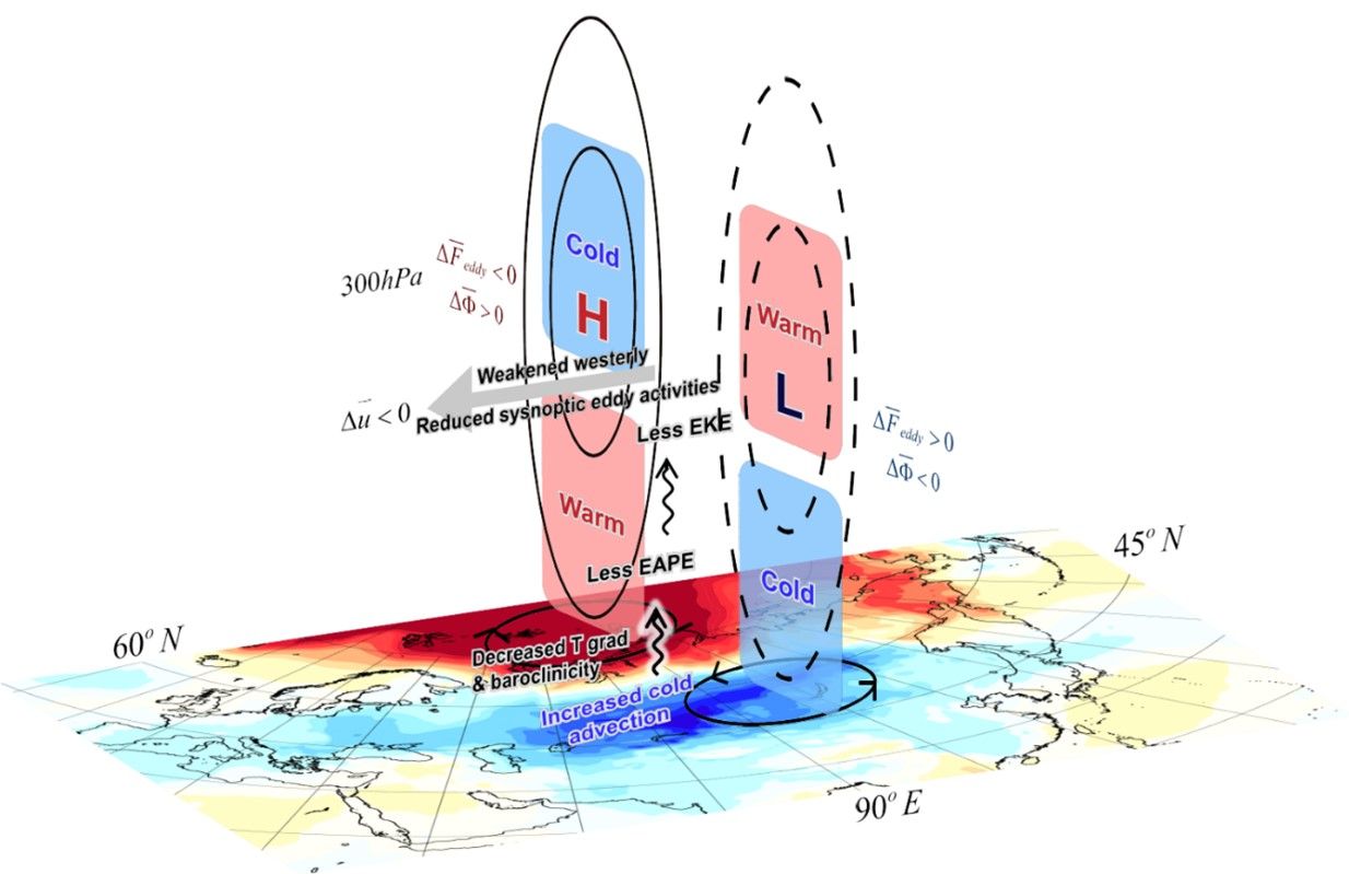 图4 冬季北极变暖通过减弱高纬度低层大气斜压性和天气涡旋活动、进而通过天气涡旋-平均流的非线性反馈导致中纬度欧亚变冷的动力机制示意图