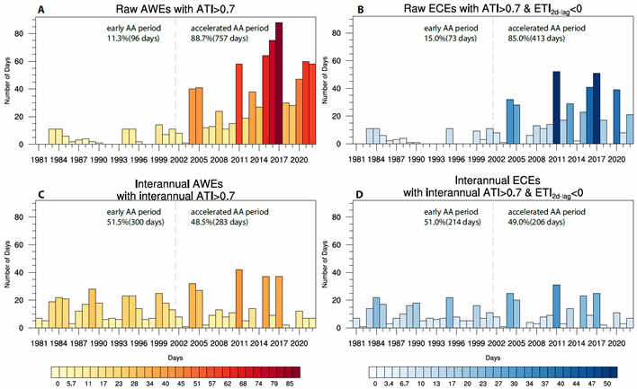 图1冬季北极暖事件日数逐年变化(左图)与其伴随的滞后2天欧亚冷事件日数逐年变化(右图)的对应关系。其中,北极温度指数(ATI)大于 0.7被定义为强的北极暖事件(AWE),欧亚温度指数(ETI)为负值则被定义为欧亚冷事件(ECE);上图结果基于原始数据,而下图结果基于年际尺度数据。北极加速变暖前期(1981-2001)和加速变暖期间(2002-2022)的AWE或ECE 总数及其百分比分别标记在灰色虚线的左侧和右侧。