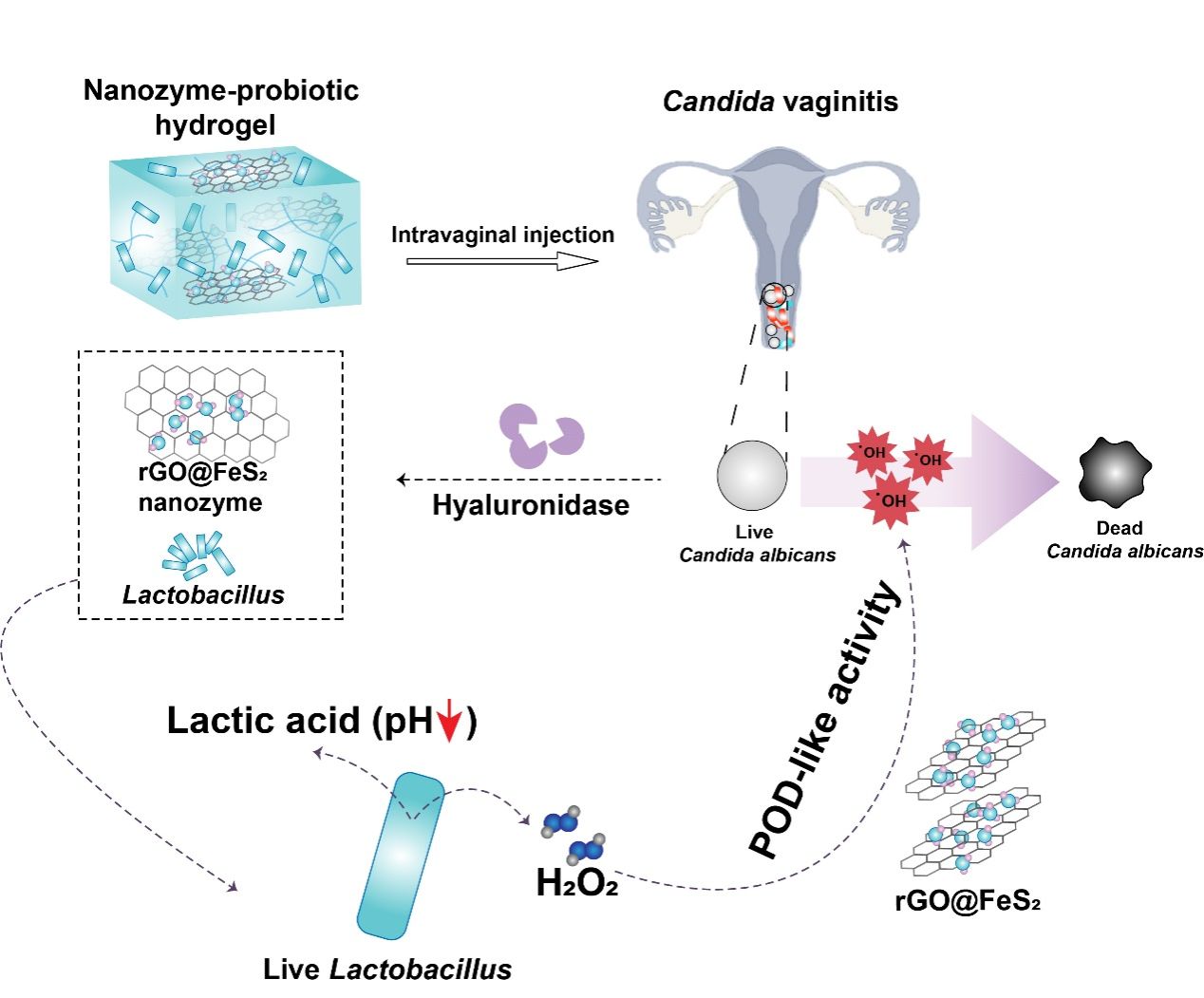 研究表明,活性氧(ROS)已被广泛应用于抗感染研究。纳米酶具有催化产生ROS的能力,在生物医学领域得到了广泛应用。一些研究表明,具有类过氧化物酶活性(POD)的纳米酶可以催化产生羟基自由基(?OH),具有较高的抗菌活性。因此,本研究设计出一种纳米酶-阴道用乳酸杆菌透明质酸水凝胶(FeLab)。在感染部位,病原菌会分泌透明质酸酶降解透明质酸而释放出乳酸杆菌和纳米酶。一方面,乳酸杆菌可以产生乳酸和H2O2降低阴道的pH;另一方面,纳米酶可以在酸性条件下充分发挥类POD活性,催化H2O2产生?OH用于杀死白色念珠菌,即可实现同时杀灭白色念珠菌和调节阴道微环境的目的(图1)。