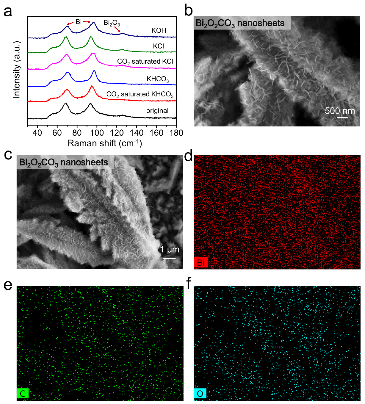 在KHCO3溶液中进行CO2还原的过程中,Bi基催化剂往往会发生原位重构的过程,然而具体的重构机理仍存在不明确之处。为对此进行探究,金钟团队在不同溶液中对Bi@Bi2O3-NDs进行电还原,发现仅在KHCO3溶液中发生了重构,在KCl与KOH溶液中则无明显变化。此外,仅在KHCO3溶液中还原后,Bi2O3的拉曼信号明显减弱。这些结果证明HCO3-在原位重构过程中起关键作用(图2a)。另外,将Bi@Bi2O3-NDs浸泡在KHCO3溶液中,发现其表面产生了许多新的小纳米片(图2b, c)。经由EDX、XPS、XRD表征,最终确定这些纳米片的组成为Bi2O2CO3(图2,图3)。故而原位重构的过程表现为:首先,Bi@Bi2O3-NDs上的Bi2O3层与HCO3-反应形成Bi2O2CO3纳米片。然后Bi2O2CO3纳米片在负电位下被还原以形成活性Bi0。根据XPS谱图,活性 Bi0并不稳定,在空气中会迅速被再氧化。经过上述反应的几个循环后,枝晶结构会完全重构,使得Bi@Bi2O3-NDs被完全转化为Bi-NFs。