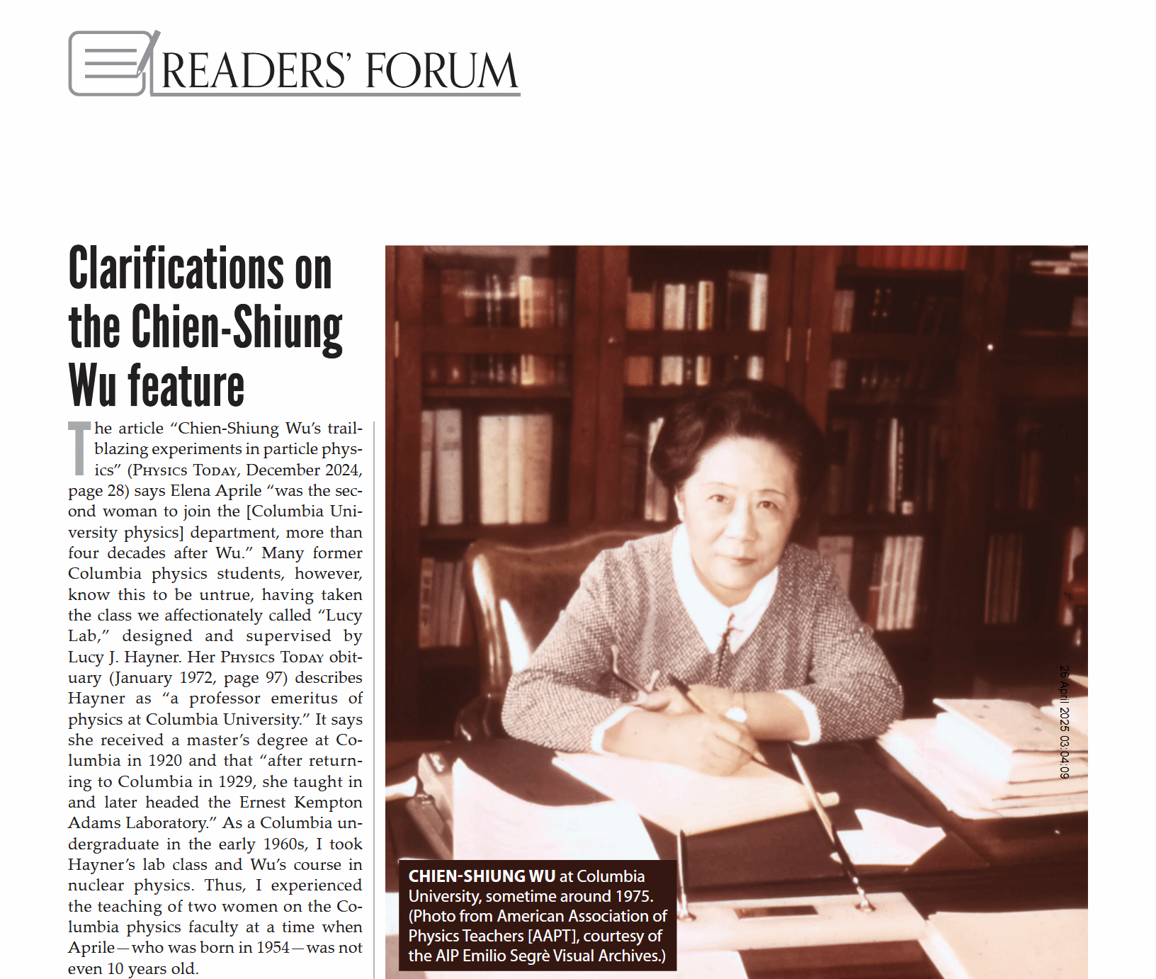 国际物理核心期刊《今日物理》(Physics Today)杂志于4月期刊首篇,刊登编辑部精选的部分读者对发表于2024年12月《今日物理》封面文章“吴健雄在粒子物理方面的开创性实验”的评价及作者的回复,并以:“吴健雄专题文章的澄清说明”为题。